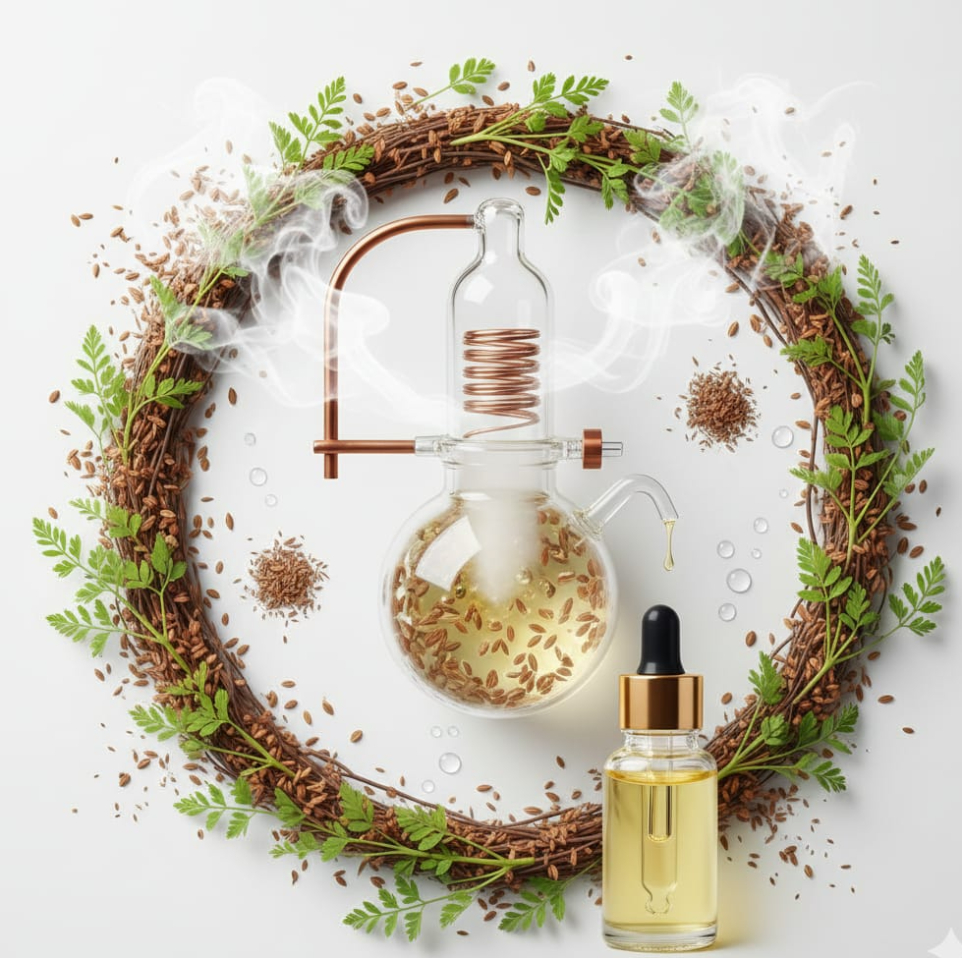 Ajwain Oil is extracted by steam distillation from the seeds of the Trachyspermum ammi plant, commonly known as Ajwain or Carom Seeds. It has a strong, spicy, and pungent aroma, rich in Thymol, which is well known for its medicinal and therapeutic properties. Traditionally valued in Ayurveda and natural medicine, Ajwain Oil is widely used in pharmaceuticals, oral care, food flavoring, and aromatherapy formulations.
