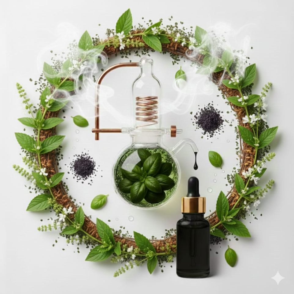 Basil Oil is obtained by steam distillation of the fresh leaves of the Ocimum basilicum plant, also known as Sweet Basil. It carries a sweet, spicy, and herbaceous aroma and is highly valued for its therapeutic, culinary, and aromatic applications. Rich in Linalool and Methyl Chavicol, Basil Oil is widely used in aromatherapy, herbal medicines, perfumery, food flavoring, and skincare formulations.