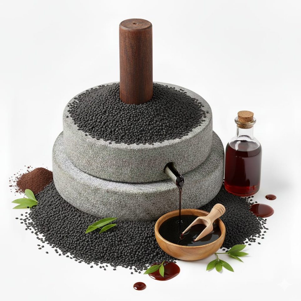 Hari Kripa Worldwide Traders (HKWTINDIA) presents 100% Natural Artisanal Stone-Pressed Black Sesame Oil, extracted traditionally using a wooden/stone ghani (kacchi ghani) method at low temperatures to maintain its natural aroma, color, and therapeutic properties.