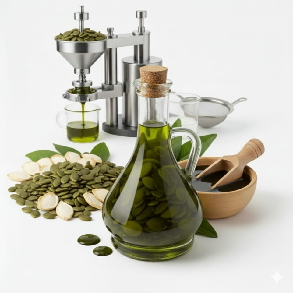 Pumpkin Seed Oil is extracted by cold pressing the seeds of the pumpkin plant (Cucurbita pepo). Known for its deep green color, nutty aroma, and rich nutritional profile, it is widely used in cosmetics, nutraceuticals, and gourmet food industries. The oil is valued for its omega fatty acids, antioxidants, vitamins, and minerals, making it highly beneficial for skin, hair, and overall wellness.