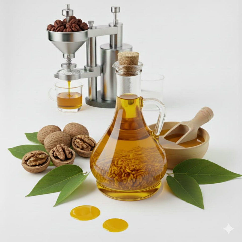 Walnut Oil is extracted through cold pressing of walnut kernels (Juglans regia), ensuring maximum retention of nutrients and natural aroma. It is rich in Omega-3 fatty acids, antioxidants, Vitamin E, and essential minerals, making it highly valued in skincare, hair care, pharmaceuticals, and gourmet food applications.